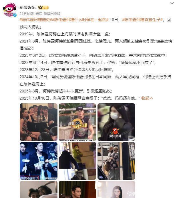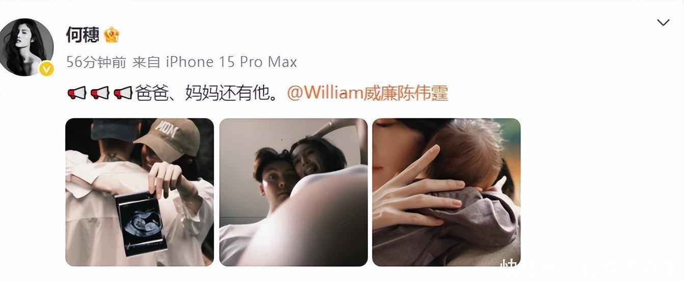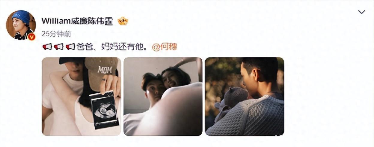 早上 10 点,娱乐圈被投下"核弹级" 喜讯10 月 18 日上午 10 点整,陈伟霆和何穗的微博同步更新,三条动态瞬间炸穿社交平台 —— 相同的配文"爸爸,妈妈,还有他",配上三张递进式照片:模糊的 B 超单勾勒出新生命轮廓,何穗孕肚微隆时依偎在陈伟霆肩头的写真,以及新生儿紧握成人手指的特写。短短 10 分钟,# 陈伟霆何穗官宣一家三口 #等 5 个话题冲上热搜榜首,评论区涌入 10 万条留言,有人笑称"这是把恋爱官宣和结婚官宣一起办了"。